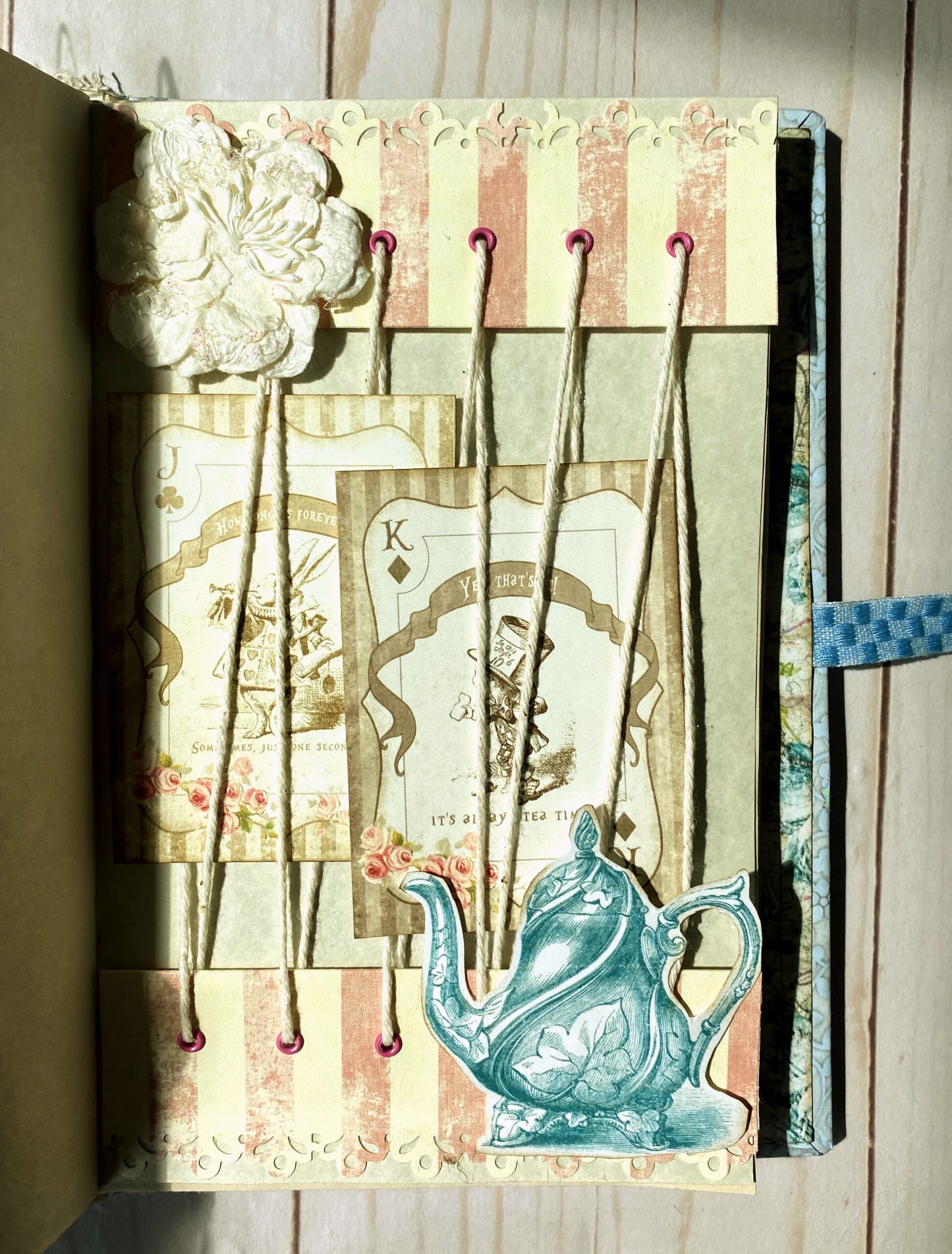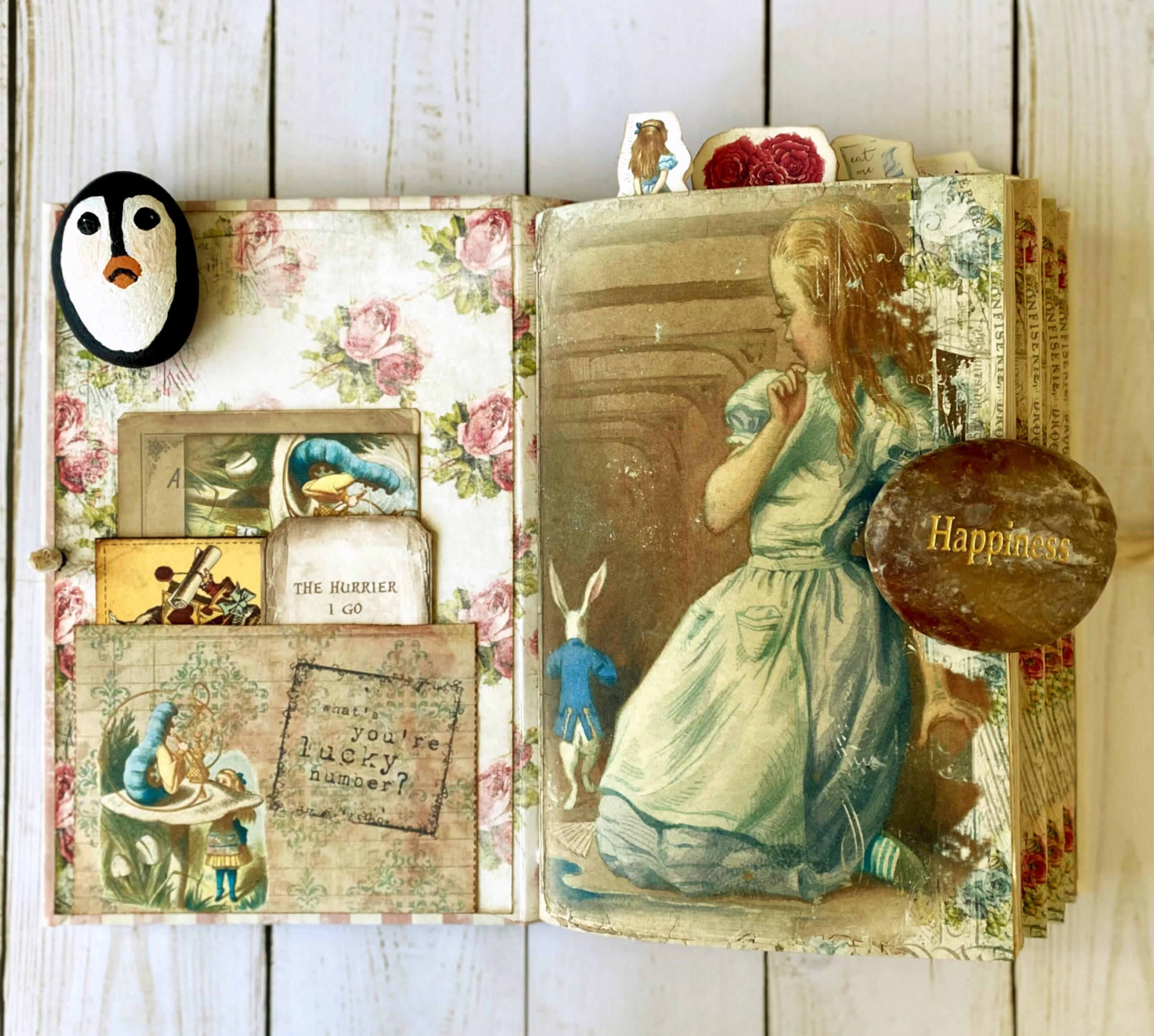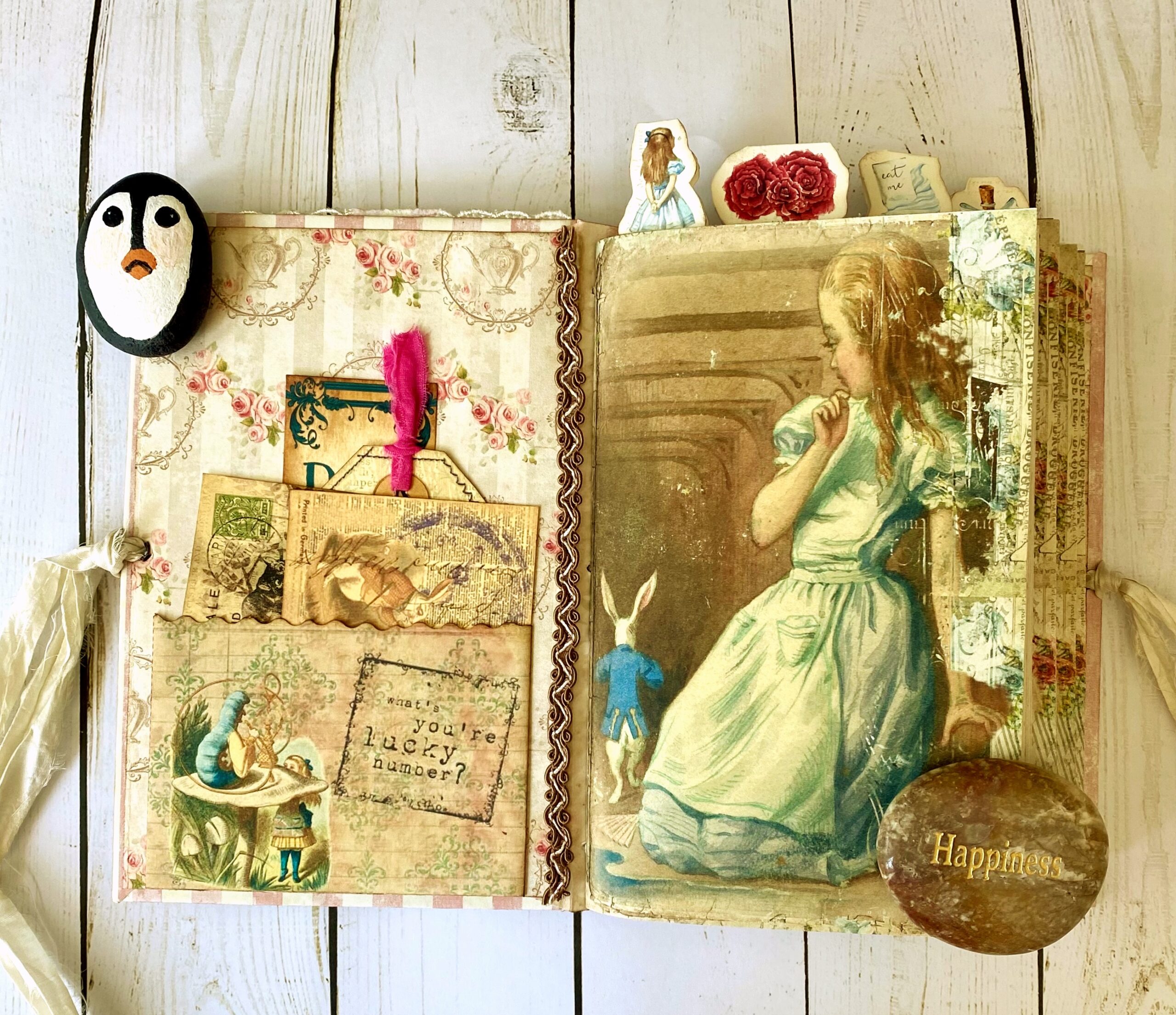 Dive into the world of Alice in Wonderland with a journal that is filled with Alice in Wonderland images and ephemera. It contains a mix of Alice themed papers, as well as coffee dyed papers. It has several pockets containing Alice related ephemera. There are four signatures with approximately 24 pages each (48 front and back). The journal measures 8 1/2 inches high and 5 1/2 inches wide and has a ribbon closure.