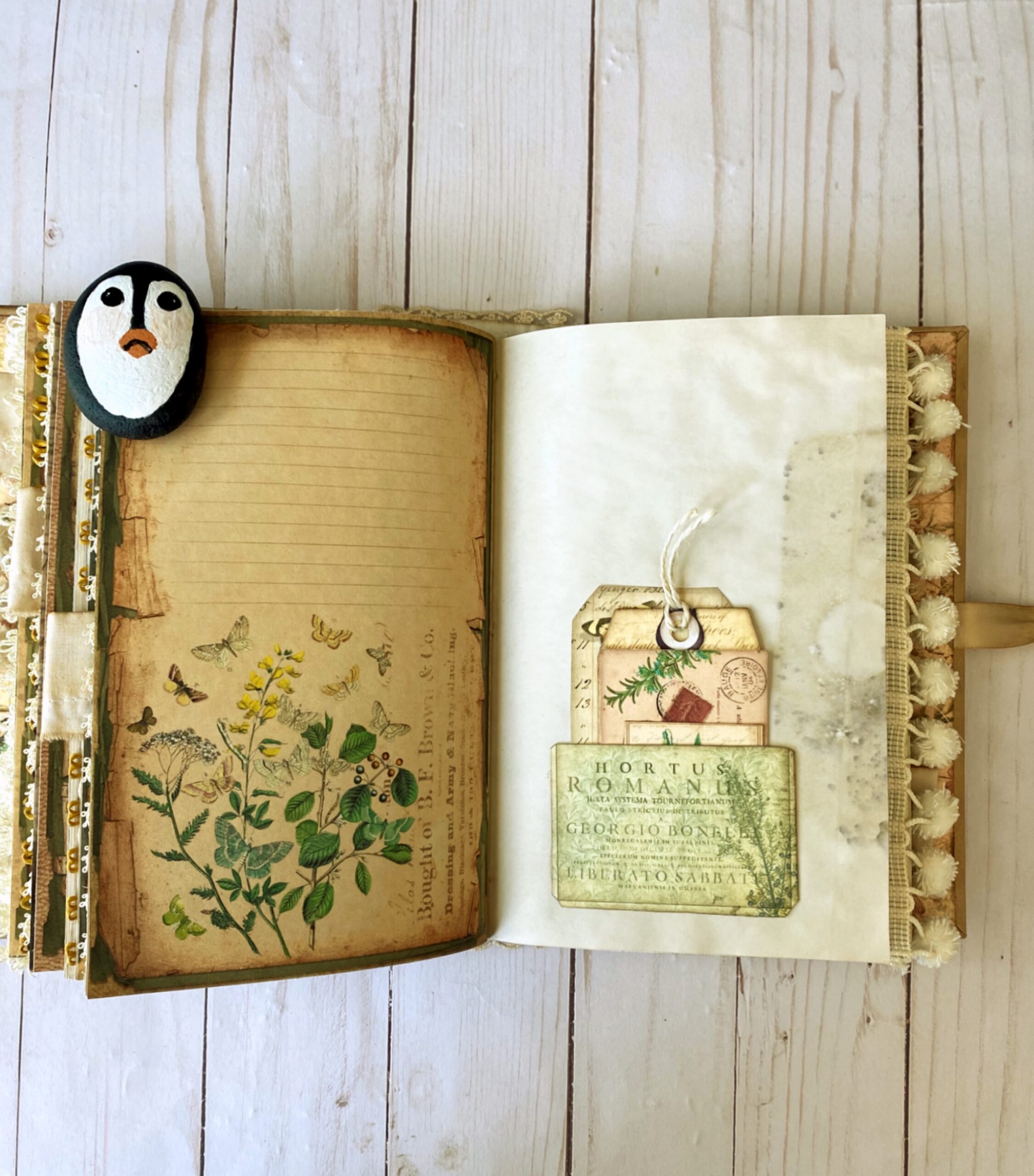 This journal will delight all garden lovers, especially those who appreciate the beauty of an herb garden. It has lots of pockets filled with a variety of ephemera. There are four signatures with 32 pages each (64 front and back). There are a variety of papers, including decorative papers, coffee dyed papers and vellum pages. The journal measures 8 1/2 inches high and 6 inches wide and has a ribbon closure.