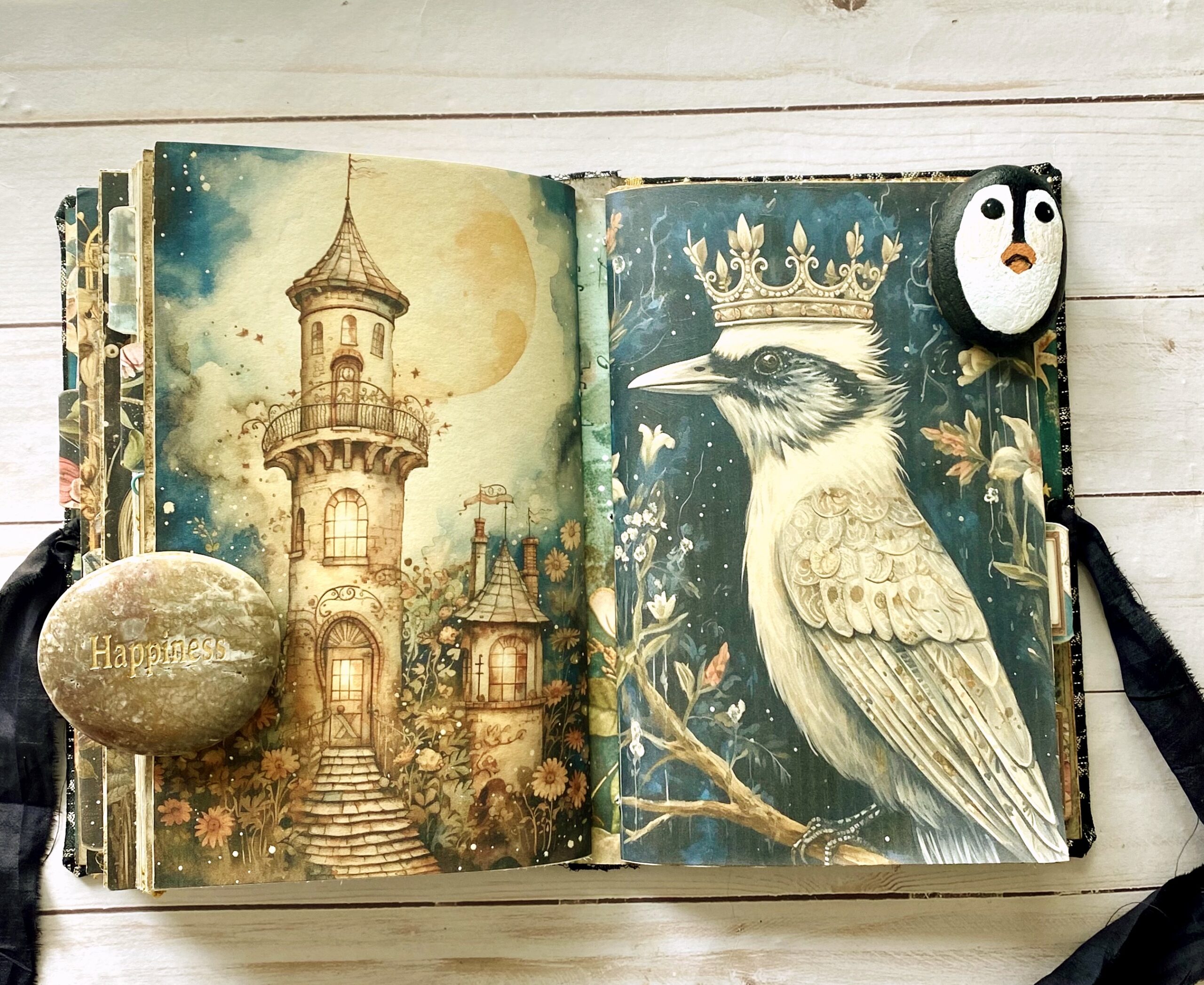 This journal is filled with gorgeous fairy tale and woodland creature themed papers set against a background of stars and full moons. There are also coffee dyed papers in addition to the printed papers which give you lots of room to write, draw, etc. in order to make this journal truly yours. It contains 4 signatures with 30 pages each (60 front and back). There are pockets throughout filled with journals cards, tags, tabs and ephemera. The journal measures 8 1/2 inches high by 5 1/2 inches wide and has a sari ribbon closure.
