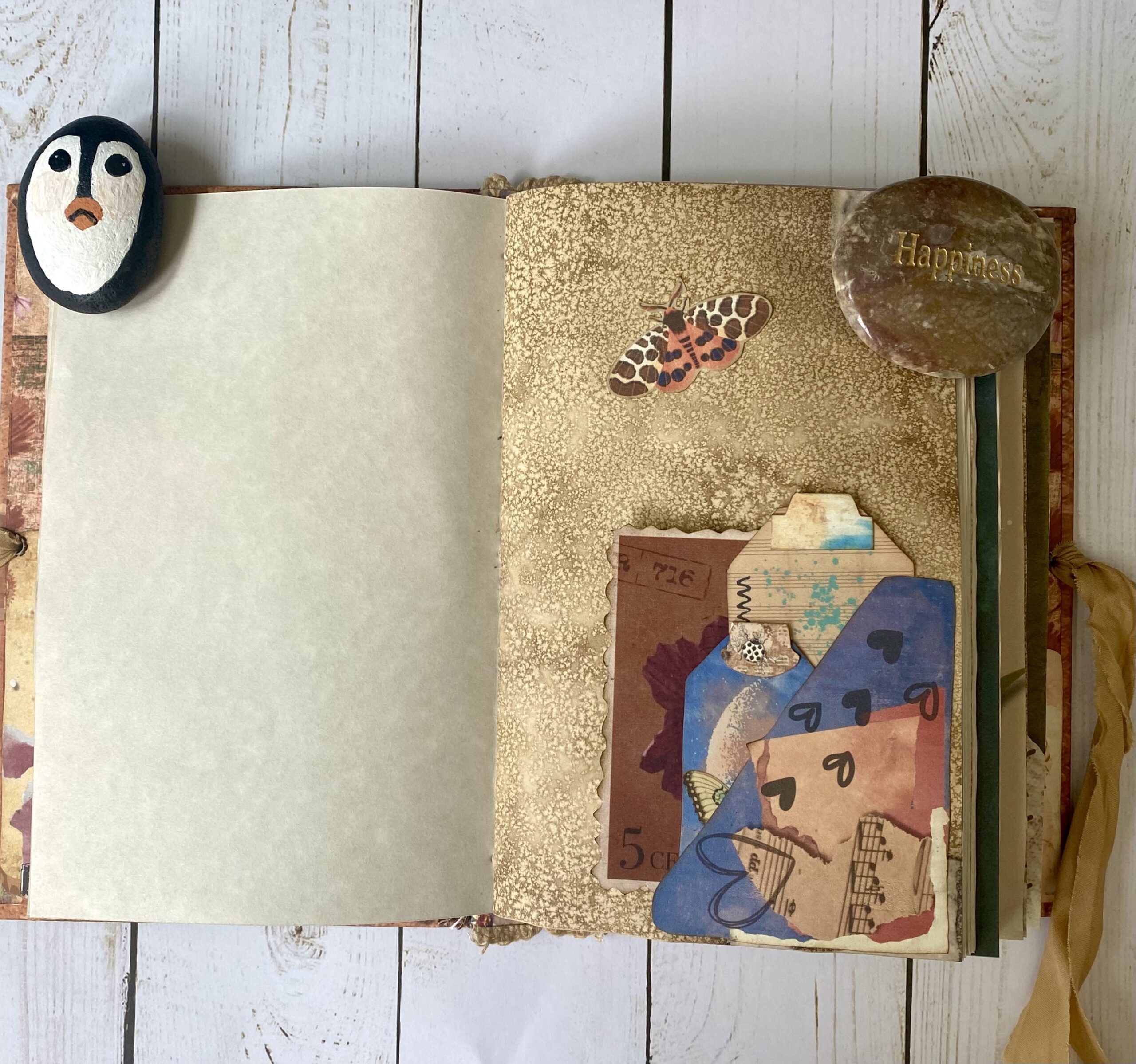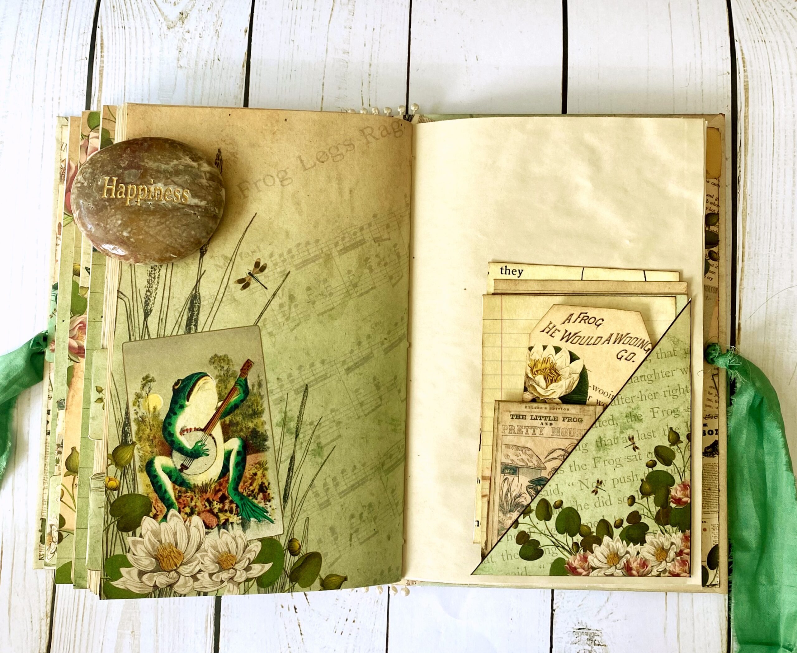 This journal is filled with adorable creatures of the marsh and pond. It contains a mix of printed papers, as well as coffee dyed papers. It has several pockets that are filled with a variety of marsh themed ephemera. There are four signatures with approximately 24 pages in each (48 front and back). The journal measures 8 1/2 inches high and 5 1/2 inches wide and has a ribbon closure.