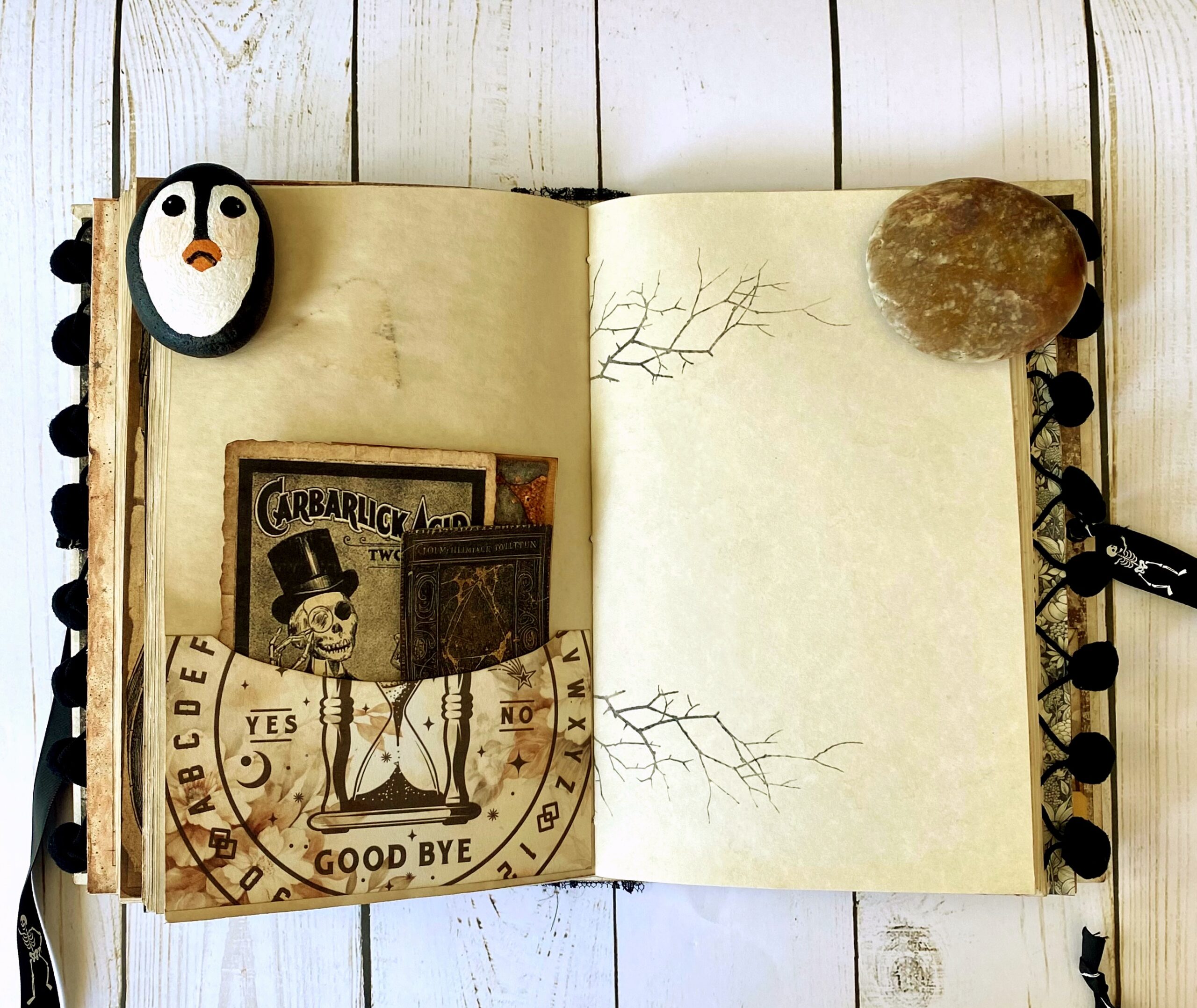 This journal celebrates Wendy Adams and the Adams family. It is filled with a mix of Adams Family and Halloween printed papers, as well as coffee dyed papers. It has several pockets that are filled with spooky ephemera. There are four signatures with approximately 24 pages in each signature (48 front and back) . The journal measures 8 1/2 inches high and 5 1/2 inches wide and has a ribbon closure.