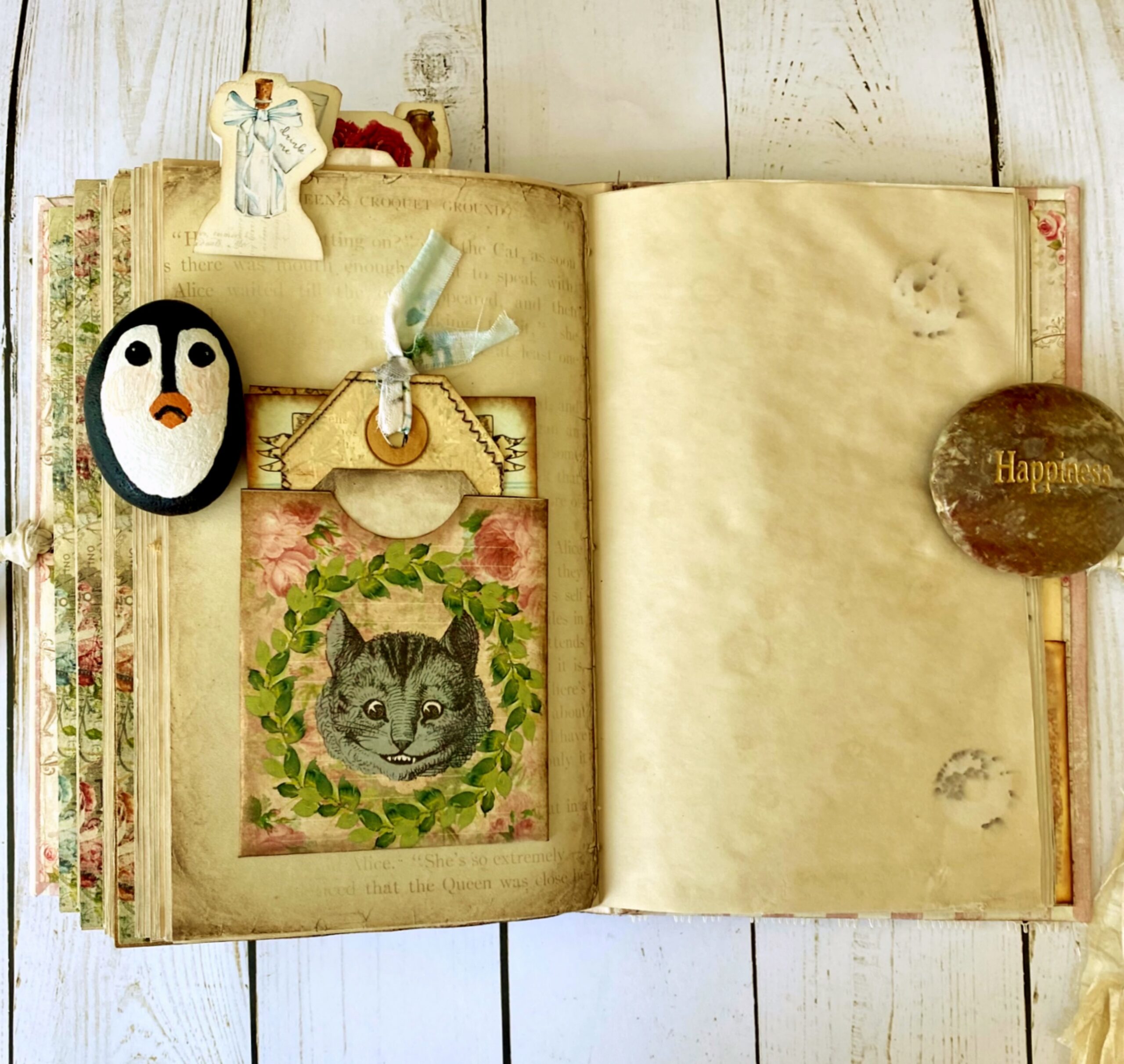 Take a trip down the rabbit hole with a journal that is filled with Alice in Wonderland images and ephemera. It contains a mix of Alice themed papers, as well as coffee dyed papers. It has several pockets containing Alice related ephemera. There are four signatures with approximately 24 pages in each signature (48 front and back). The journal measures 8 1/2 inches high and 5 1/2 inches wide and has a ribbon closure.