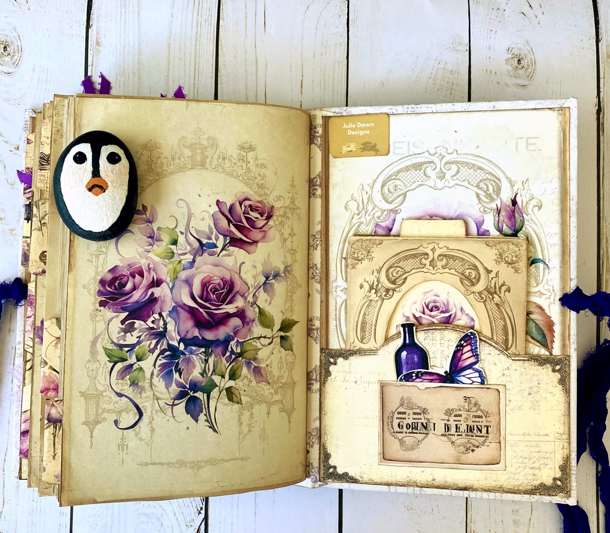 If you are a nature lover, this journal is for you. The cover features a 3D magnifying glass and a butterfly. It is filled with a mix of nature themed papers and coffee dyed papers. It has numerous pockets throughout which contain an assortment of tags, cards, tickets, etc. There are four signatures with 24 pages in each (48 front and back). The journal measures 8 1/2 inches high and 5 1/2 inches wide and has a ribbon closure.
