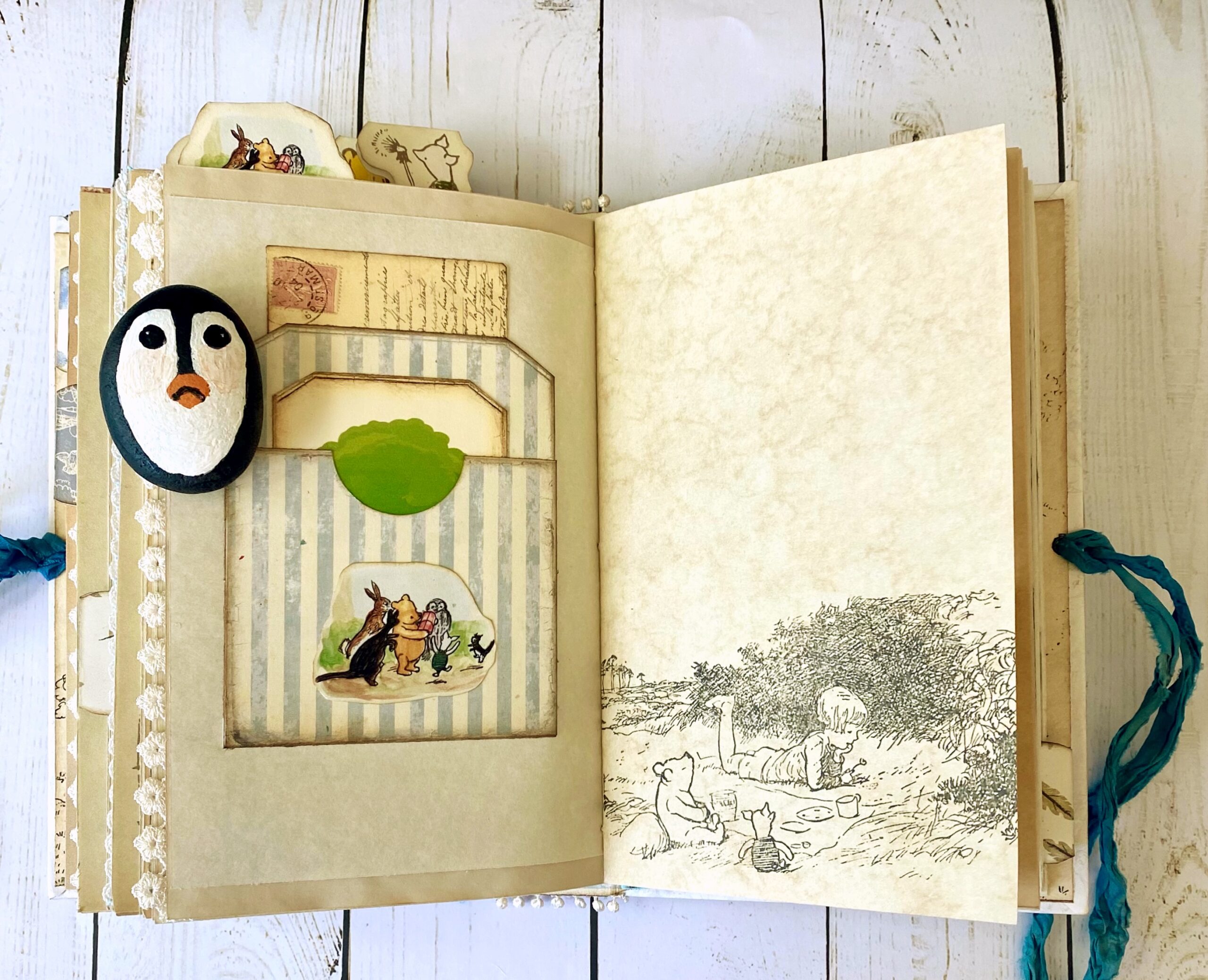 This journal is filled with all things Winnie the Pooh and Friends. It contains coffee dyed papers, as well as Winnie the Pooh themed journal pages. It has lots of pockets, which are filled with Winnie the Pooh ephemera. There are 3 signatures, with 40 pages each (80 front and back). The journal measures 8 1/2 inches high and 5 1/2 inches wide and has a ribbon closure.